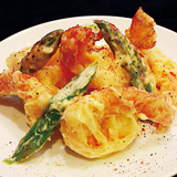 ほど良い食感を残してボイルした藤崎町産のアスパラとカラッと揚げたバナメイ海老を特製オーロラソースで和えた自慢の逸品です。オーロラソースにはトキワ養鶏の卵を使用したマヨネーズも入ってるよ!あどはだり間違いなし!!