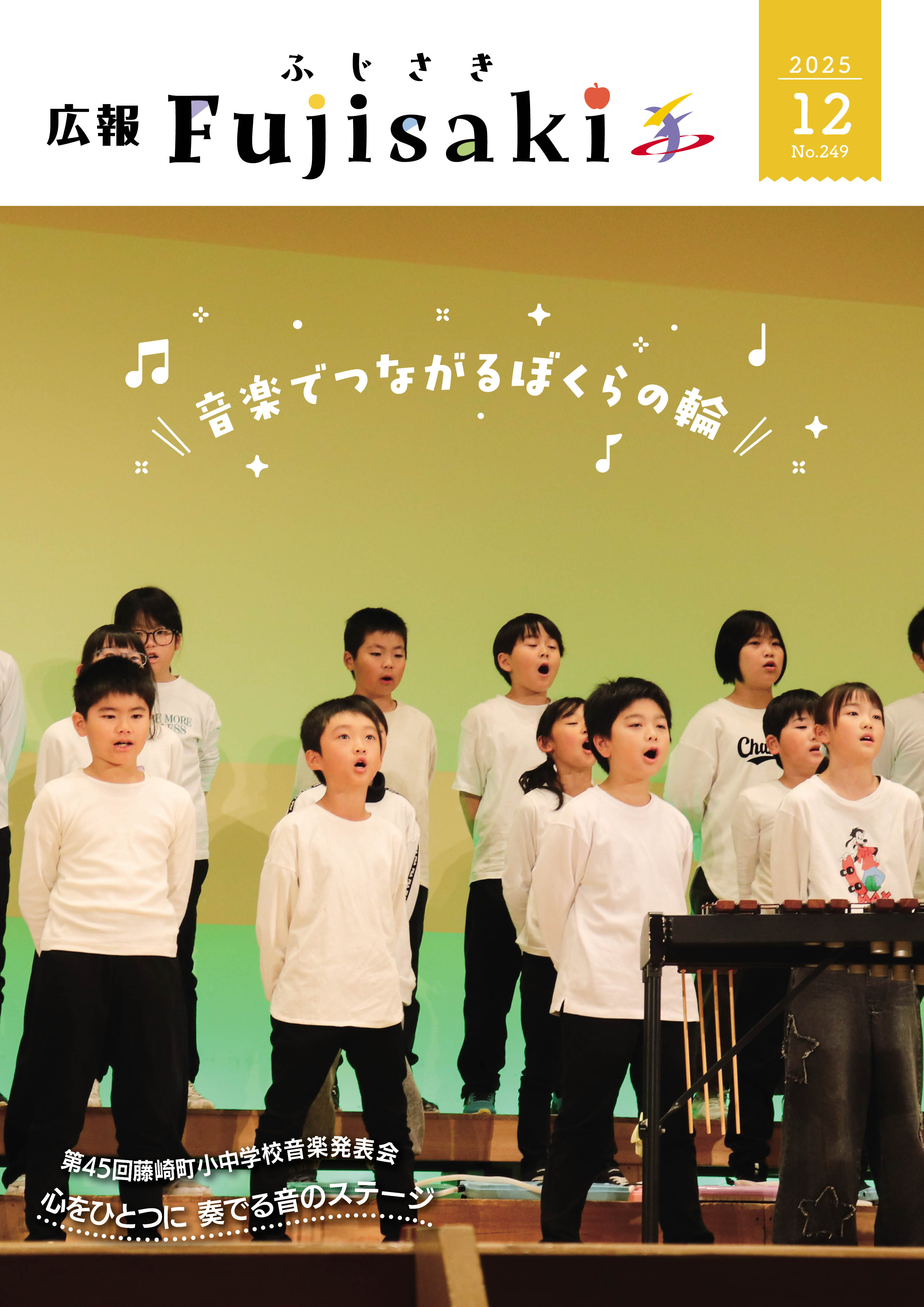 今月の表紙は、10月24日に行われた第45回藤崎町小中学校音楽発表会の様子です。会場には多くの保護者や地域の皆さんが訪れ、児童・生徒たちの演奏や歌声に温かな拍手が送られました。