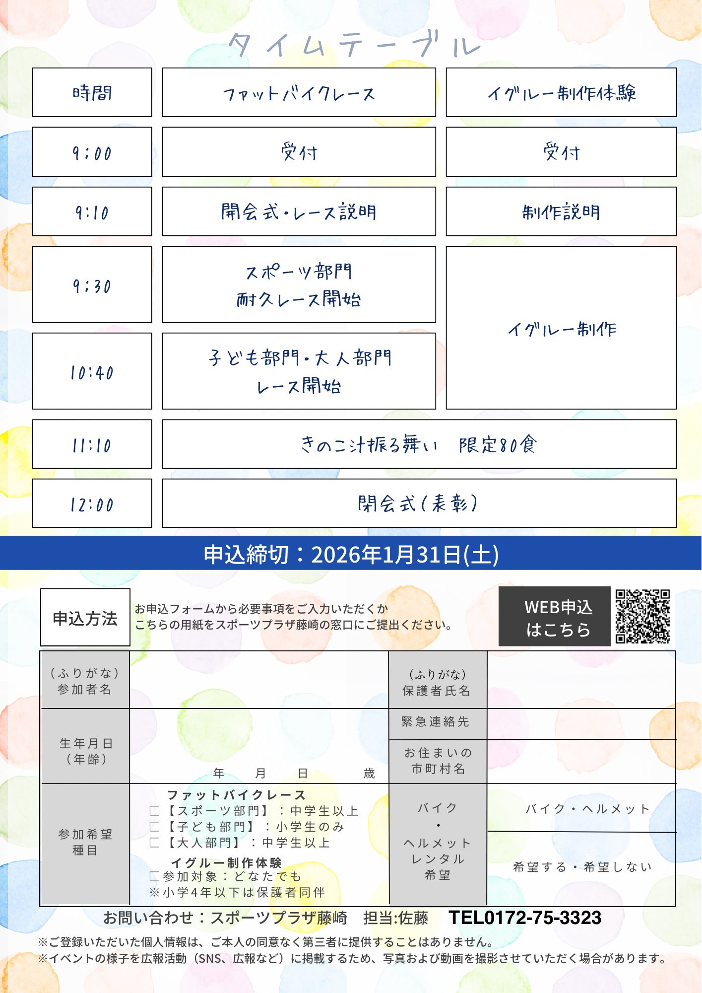 - ファットバイクレース参加者は、マウンテンバイクの持参をお願いします。なお、貸出をご希望される方は事前にお申込みください。