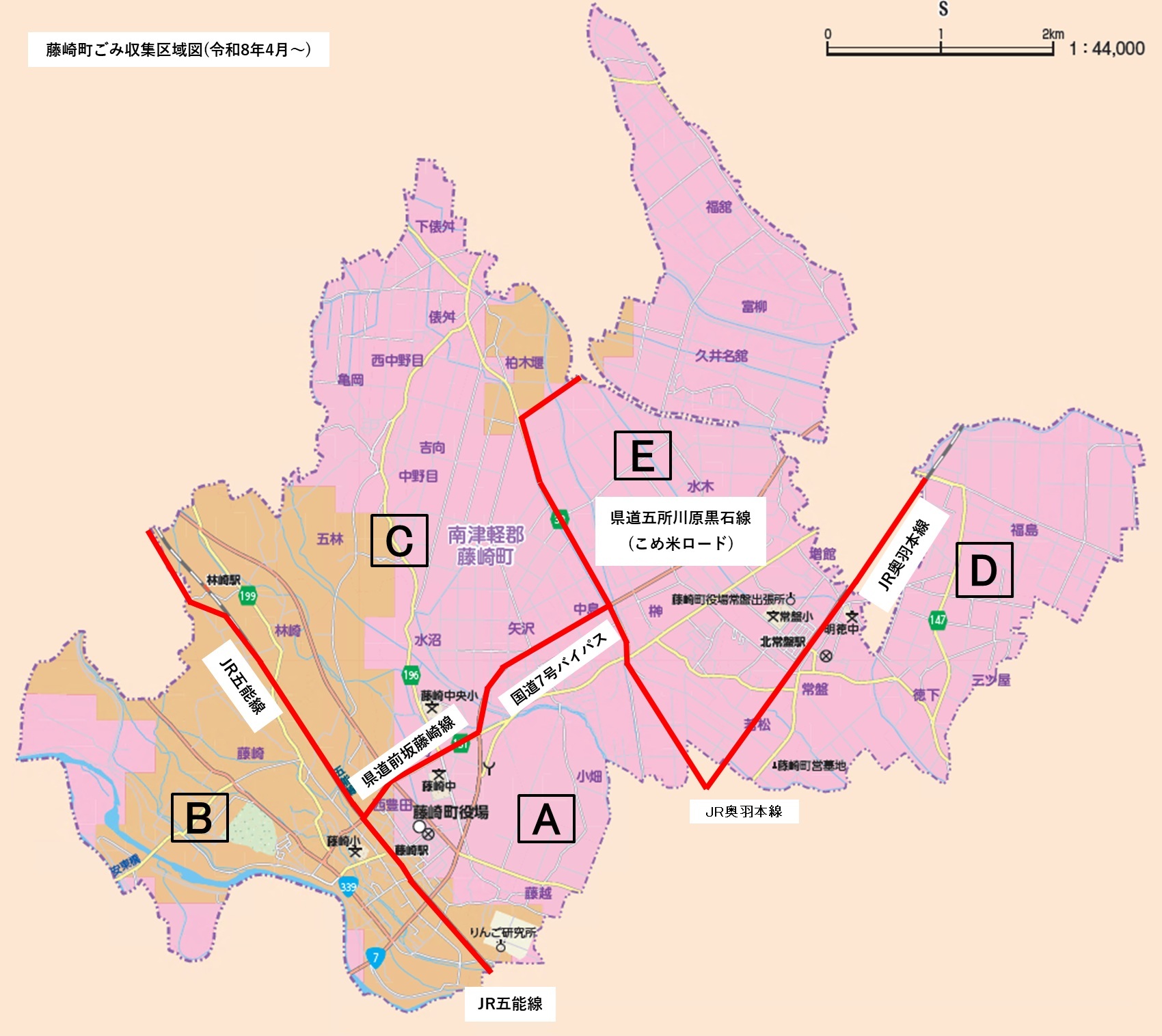 ・JR五能線(奥州街道踏切)から県道前坂藤崎線 ⇒ 国道7号バイパス交差点(常盤バイパス藤崎入口) ⇒ 県道五所川原黒石線(こめ米ロード)交差点より南側はA地区、北側はC地区となります。