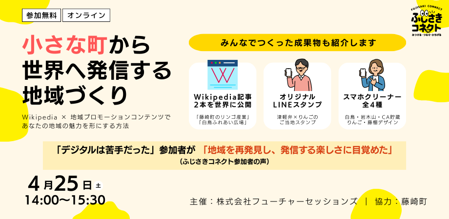 【4/25(土)開催】ふじさきコネクトオンライン対話イベント「小さな町から世界へ発信する地域づくり~Wikipedia×地域プロモーションコンテンツで、あなたの地域の魅力を形にする方法~」